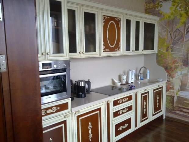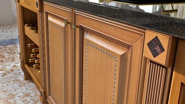Такое покрытие оптимально потому, что оно лучше защитит дерево от высыхания, температурных перепадов, влажности, к тому же оно поможет украсить кухонный гарнитур.