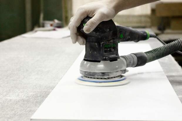 - С ДСП убирают ПВХ-пленки и шлифуют.