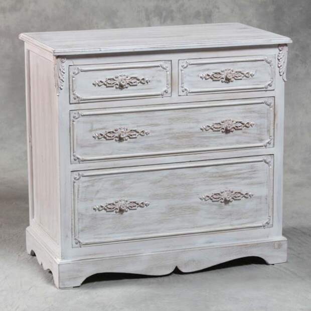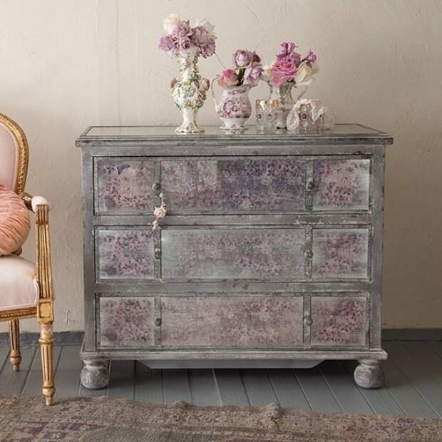 В оформлении комода приветствуется эффект потертой от времени поверхности. Дизайн изделия может отличаться от другой мебели в комнате и ярко выделяться на ее фоне. Красиво и необычно на потертой поверхности будет смотреться декупаж и роспись.