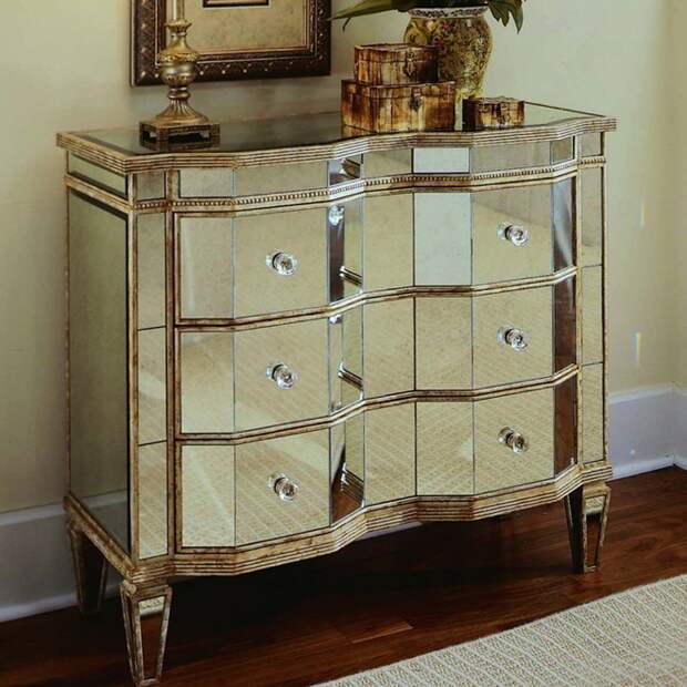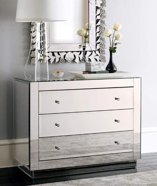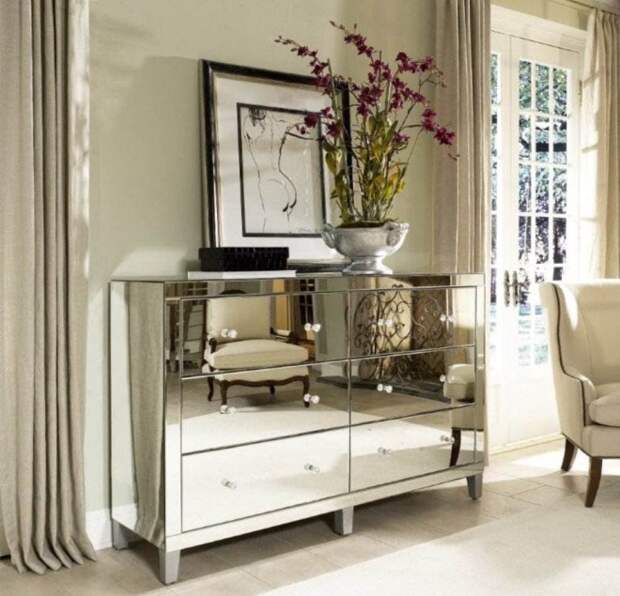 Очень необычно в дизайне любой гостиной будут смотреться комоды, изготовленные из закаленного стекла или зеркальные. Используя эти материалы, удается получить необычные и стильные конструкции. Чаще всего стеклянные и зеркальные модели выполняют функцию украшения зала и используются для хранения сувениров и прочего декора. Модели, дополненные подсветкой, – настоящее произведение искусства.