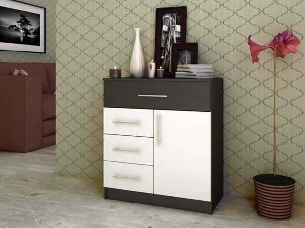 Изделия отличаются по высоте, количеству выдвижных ящиков, цвету и дизайну. Главная особенность этой мебели в том, что она универсальна, так как обустроить гостиную с ее помощью получится независимо от стиля интерьера.Модели и виды комодов