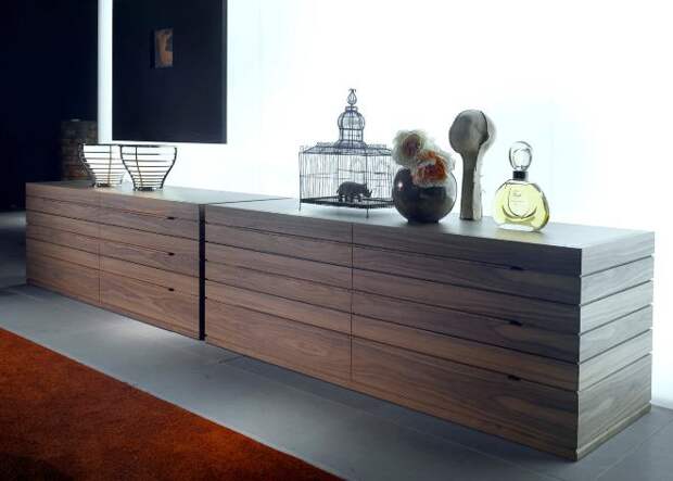 Выгодным дизайнерским решением для просторной комнаты станет модульная модель. Эта конструкция состоит из 2-3 модулей, которые очень просто переставляются и комбинируются между собой. Такие длинные комоды подразумевают наличие тумбы со шкафчиками и выдвижными ящиками, а также стеллажами. Основание может быть дополнено снизу колесиками, благодаря чему конструкцию удобно перемещать по залу.