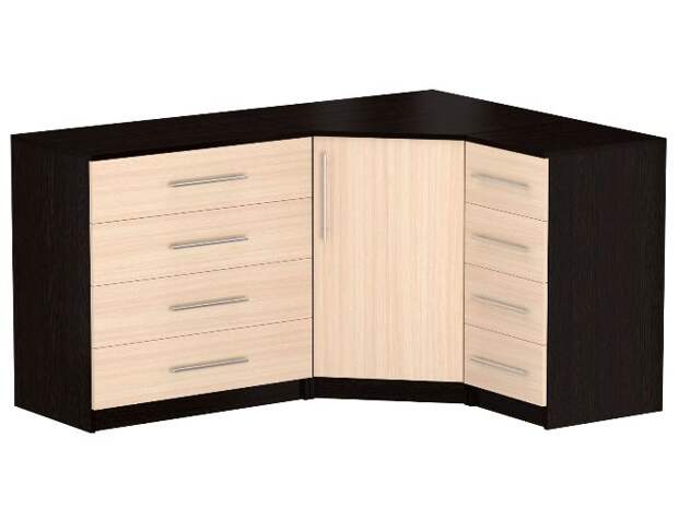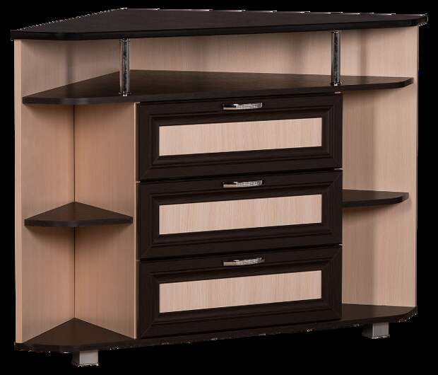 Удачным вариантом для маленькой гостиной станет угловой комод. Его высота не более 1 м, однако при этом конструкция очень вместительна. Изготавливается изделие в виде ромба, когда передняя часть выступает в середину. Не менее эстетично выглядит угловой комод для гостиной, выполненный в форме раскрытой книги, когда две части обращены друг к другу.