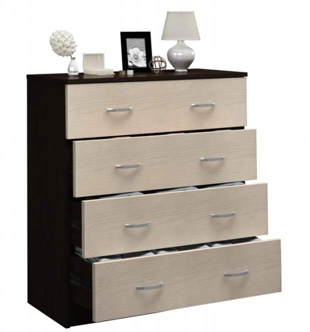 Не редко мебель, изготовленная из ДСП, дополнительно покрывается шпоном. Шпонированные изделия идеально имитируют поверхность натурального дерева. Комод не боится влаги и не расслаивается при использовании. Небольшой вес конструкции позволяет в любой момент сделать перестановку в гостиной.