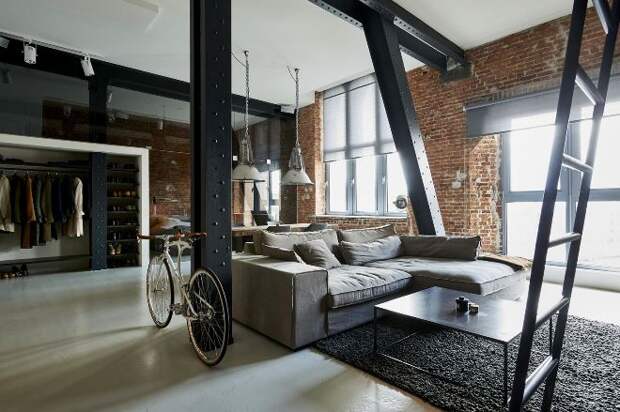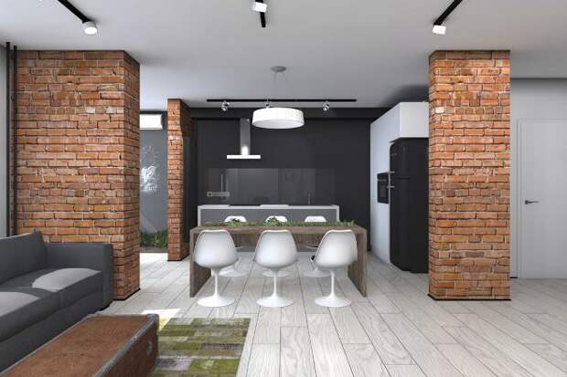 Это американский стиль, который имитирует заброшенные склады или производственные помещения. Лофт предполагает использование только прочных материалов. Для этого применяется бетон, кирпич, натуральный камень или металл. Главная особенность колонн заключается в шероховатой фактуре и природных цветах. Их не нужно облицовывать, именно в таком виде они выражают неординарность и смелость. Однако на них можно расположить семейные фотографии или повесить зеркало, которое позволит визуально расширить площадь.