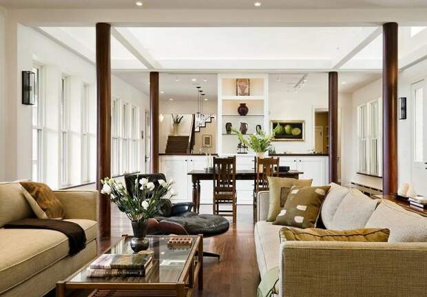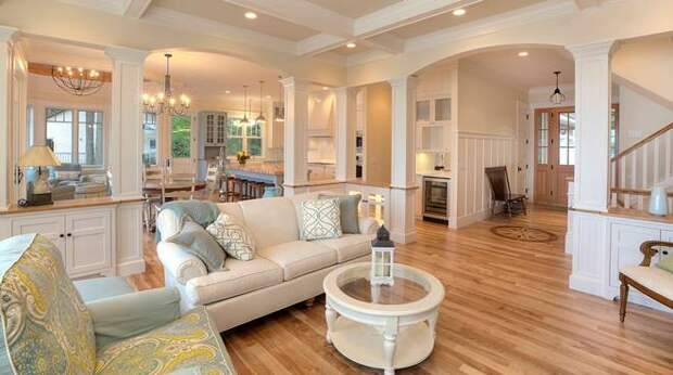 Особенность заключается в открытой планировке, в которой колонны служат не только декоративным элементом, но и разграничивают помещение. Чтобы правильно акцентировать внимание на сооружения в американском стиле, для их выполнения применяют дерево или камень. Все конструкции должны соответствовать общей идее и сочетаться с настенным или напольным покрытием.