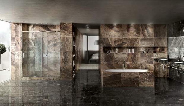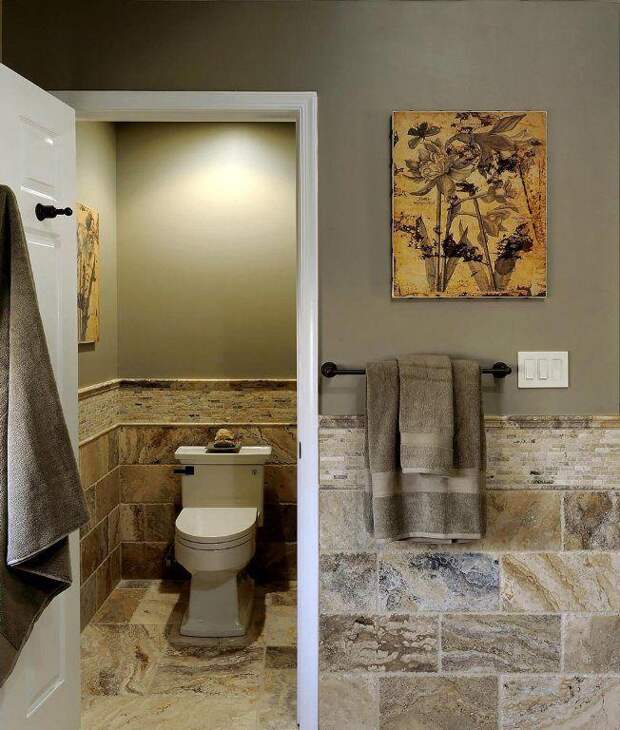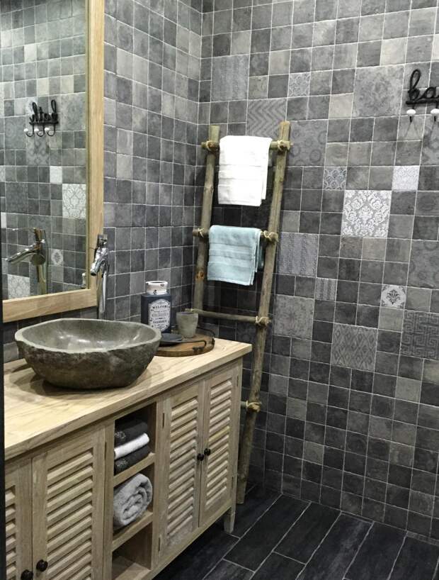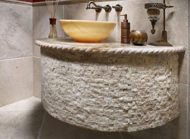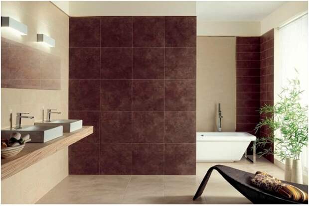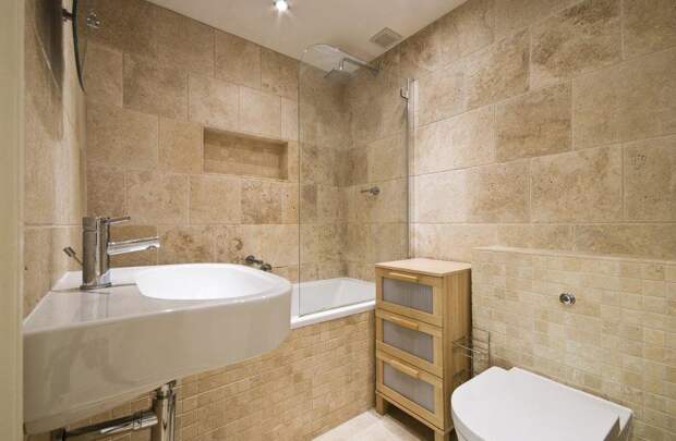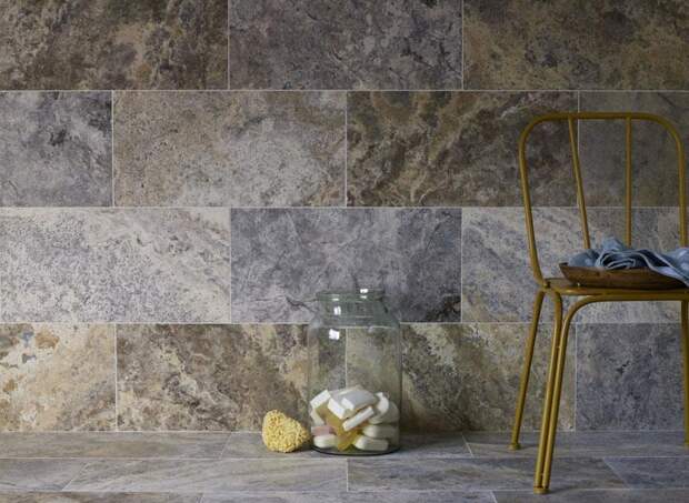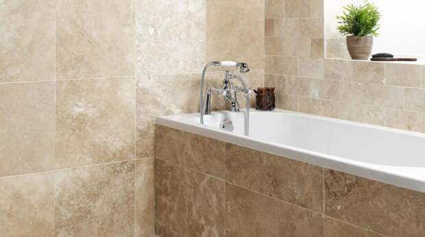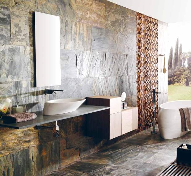 Плитка под натуральный камень используется для внутренней отделки ванной комнаты нечасто из-за высокой влажности помещения.