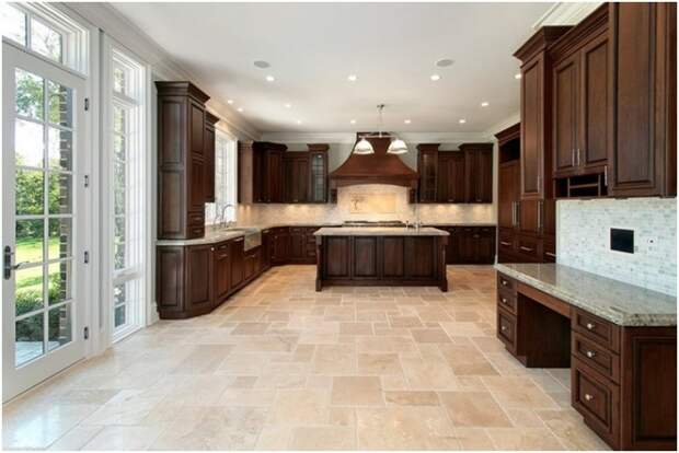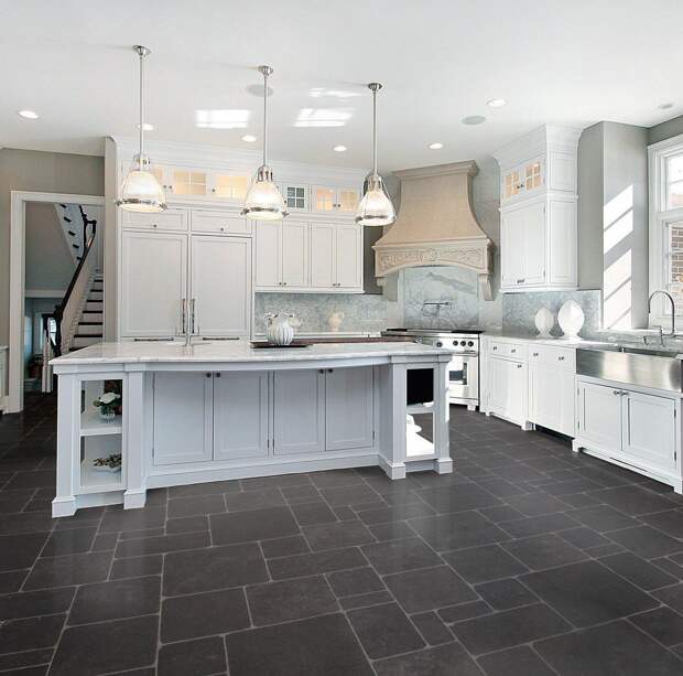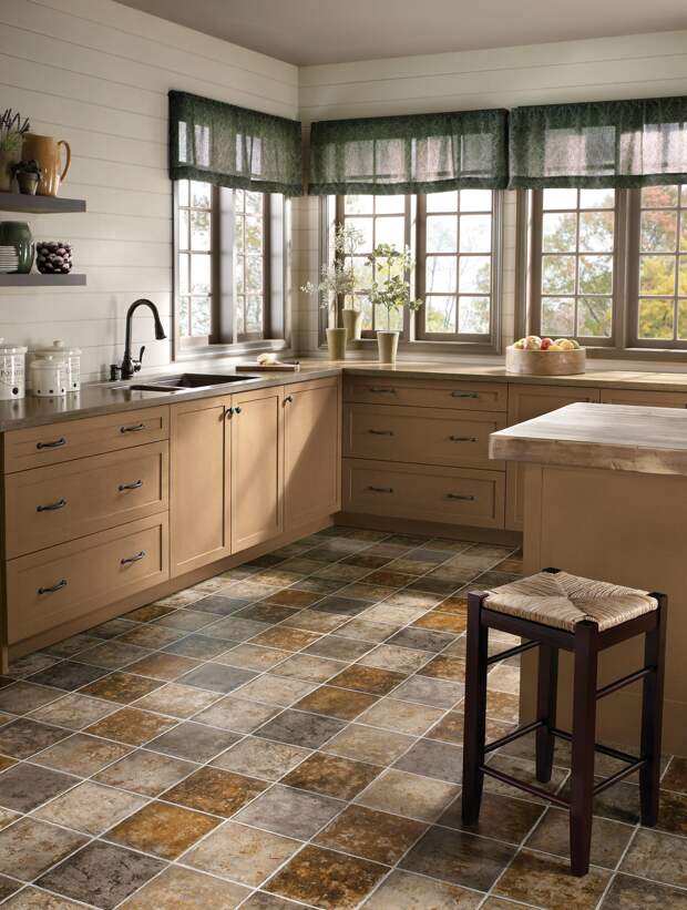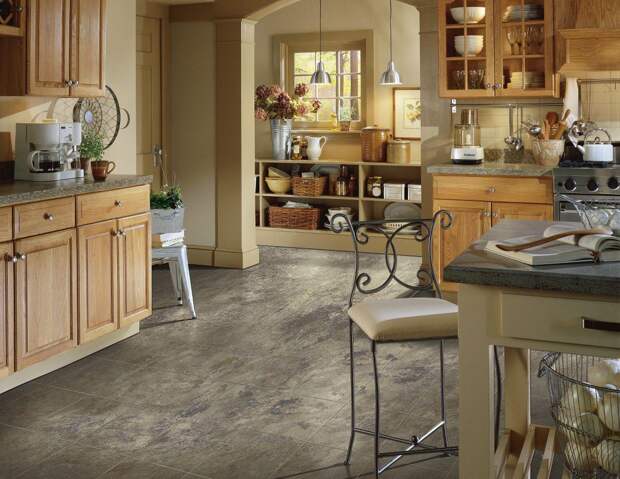 Для кухни надо выбирать материал, с которым легче поддерживать чистоту. Также половое покрытие должно быть долговечным. Для этого отлично подойдут керамогранит или керамика.