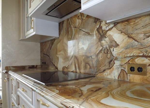 Оникс – очень красивый камень, который не все могут себе позволить. Отличное решение – имитация под него. Такая плитка бывает розовых, янтарных оттенков с яркими параллельными прожилками. Чем-то похожа на мрамор. Одинаково подходит для отделки стен и пола.