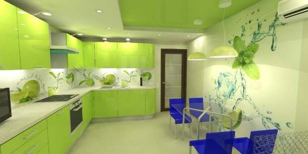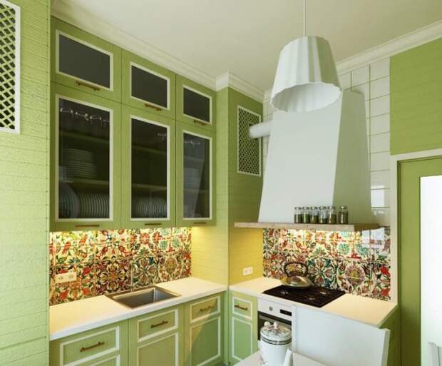 Стандартный кухонный окрас – это светлая зелень, способная задать позитивное настроение и поднять аппетит. Светлая кухонная зона может расширить данное пространство и внести легкость в интерьер, даже если речь идет о маленькой кухне в «хрущевке». Данный оттенок одинаково нравится взрослым и детям, создавая на кухне особую семейную атмосферу. Вместо мебели и стен можно задействовать небольшие элементы: гардину, цветочные горшки, посуду, сундук для столовых приборов.