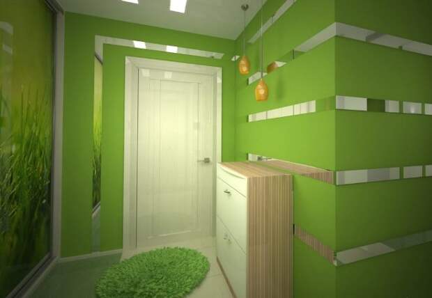 Коридор – это место, с которого начинается дом. Часто он является прихожей или плавно перетекает в эту комнату. Здесь важно учитывать отсутствие солнечного освещения, которое хозяева заменяют светлыми обоями или белым кирпичом на стенах. Разбавить светлую стилистику интерьера помогут броские и темные оттенки зелени: нефрит, цвет бутылочного стекла, изумруд или насыщенная трава. Они воплощаются в виде мебели или декора. Это может быть диванчик для обуви, картина, живые цветы.