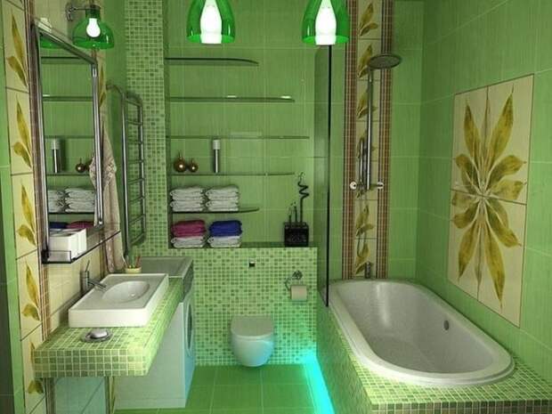 Дизайн ванной комнаты или санузла отлично впишет в свое пространство темные оттенки зеленого: изумруд, морскую синеву, бирюзу. Городская квартира хорошо сможет сочетать их с белой сантехникой, создавая приятную морскую атмосферу. Дополнить темные оттенки поможет черный, сиреневый и золотой.
