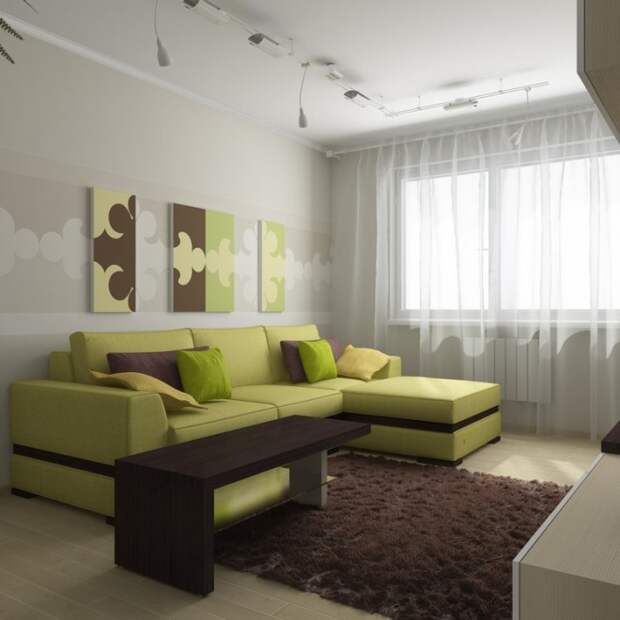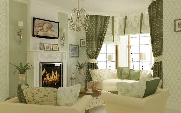 Светло-зеленый гармонично впишется в пространство гостиной комнаты. Часто это место выступает и кабинетом для одного из членов семьи. Для такой комнаты используют спокойные и уверенные тона: оливковый, салатовый, землистый. Они способны расслабить и сосредоточить на выполнении конкретной задачи. Тона могут присутствовать на стенах, фотообоях, текстиле или мебельной обивке.