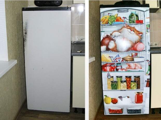 Если вам надоел простой белый холодильник или на нем появились повреждения, ситуацию можно легко исправить с помощью самоклеящейся пленки. Особенно это актуально для тех людей, которые много времени проводят на кухне. Такое покрытие украсит бытовой прибор и будет радовать глаз долгое время.