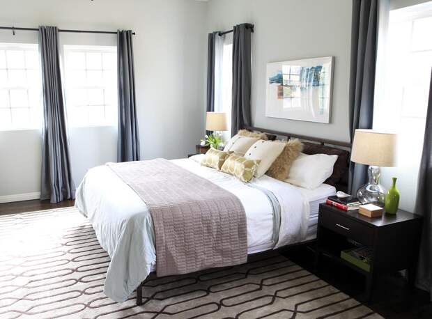 Если оконные проемы расположены на одной стороне, то это наиболее удобный вариант планировки. В этом случае кровать лучше всего располагать в простенке между окнами: жар от батарей и сквозняк из окна не будут беспокоить жильцов квартиры.