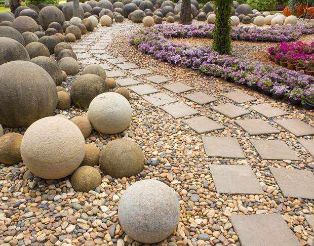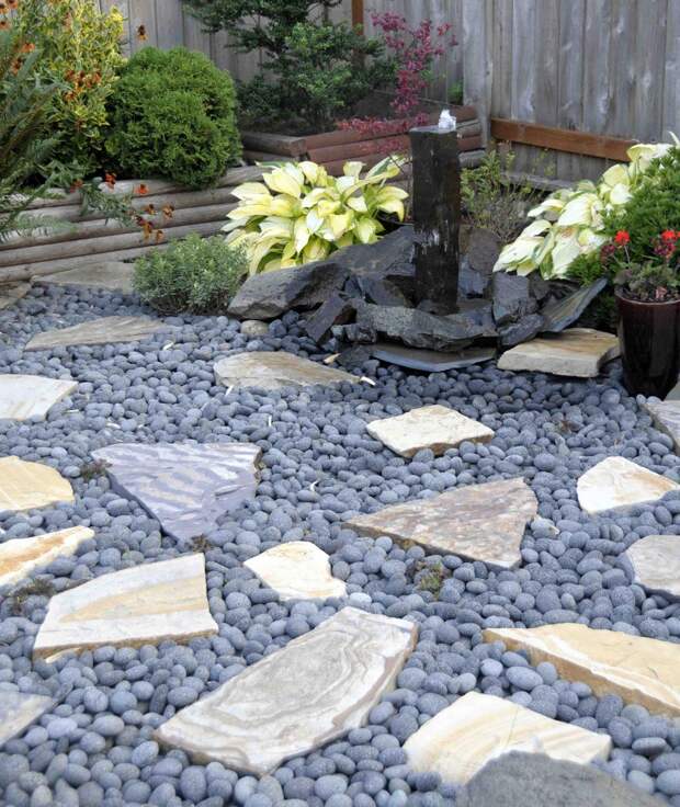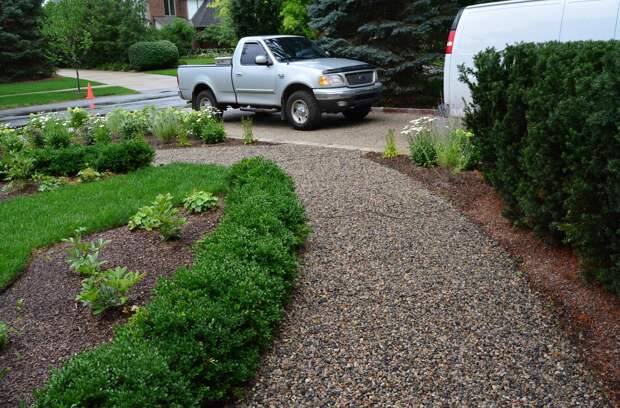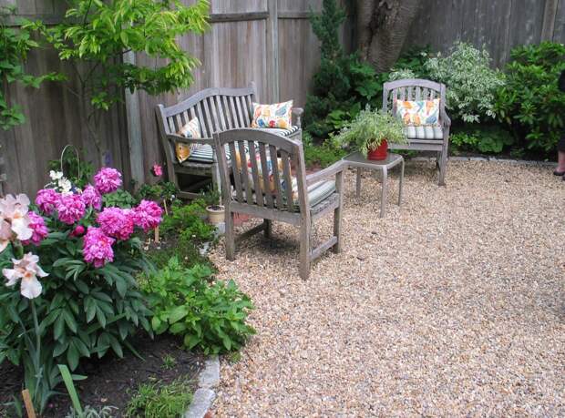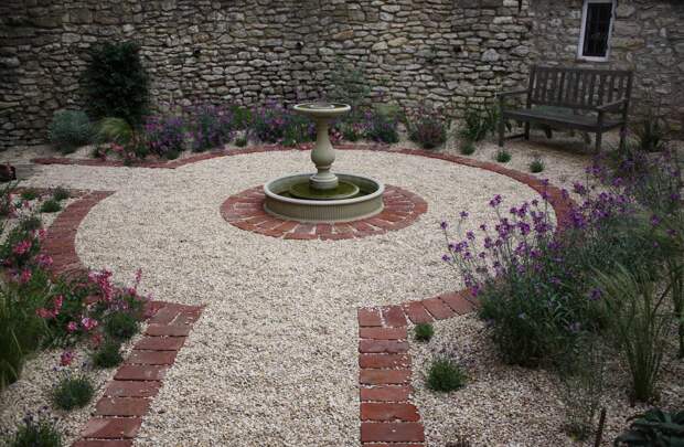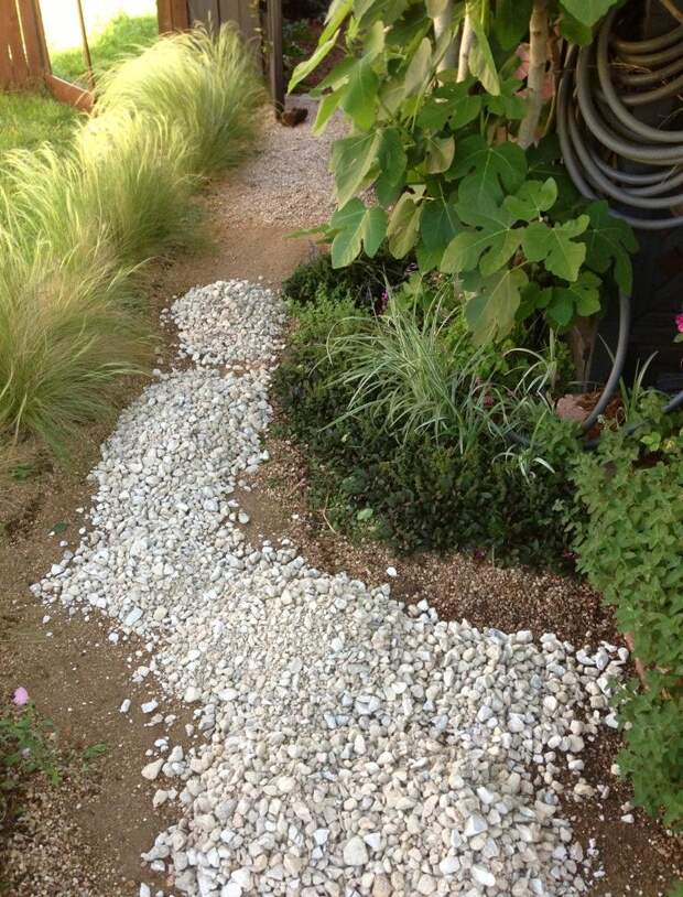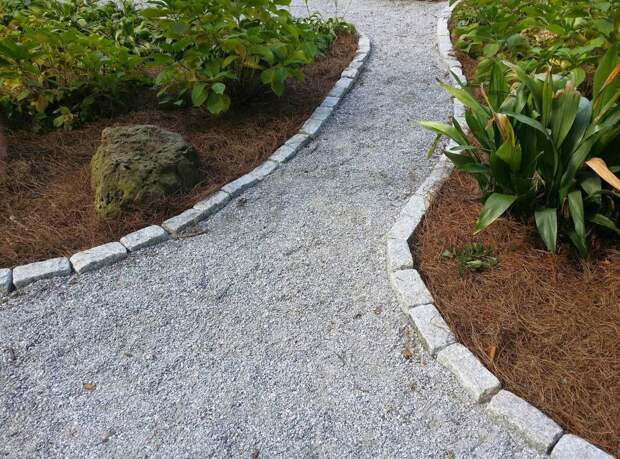 - гравий просто насыпается на песчаное ложе, легко пропускает влагу и устойчив практически перед всем. Но его легко размывает дождями, а ходить по нему в тонкой обуви или босиком очень некомфортно;