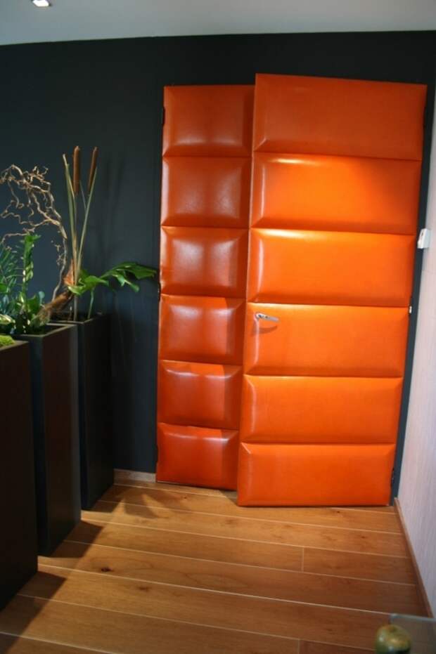 Достоинством такой обивки являются высокие звукоизоляционные и теплоизоляционные показатели. Стоит также отметить их практичность и водонепроницаемость. «Мягкие двери» часто используются для декора рабочих помещений, кабинетов. Они выглядят достаточно массивно, но, если выбрать подходящий цвет, можно сделать их изюминкой практически любого интерьера.