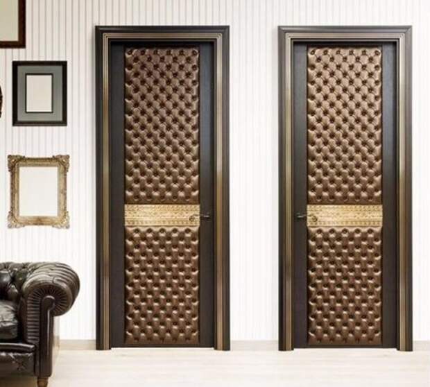 Мягкую обивку обычно делают из дермантина и винилискожи. Первый материал сейчас считается устаревшим: в современном дизайне активно используется обивка из кожзама. Ее применяют для различного декора, в том числе межкомнатных дверей. Для придания изделию особого изящества по-прежнему используют декоративные гвозди. Существует множество необычных вариантов их размещения на полотне, каждый может выбрать узор себе по душе.