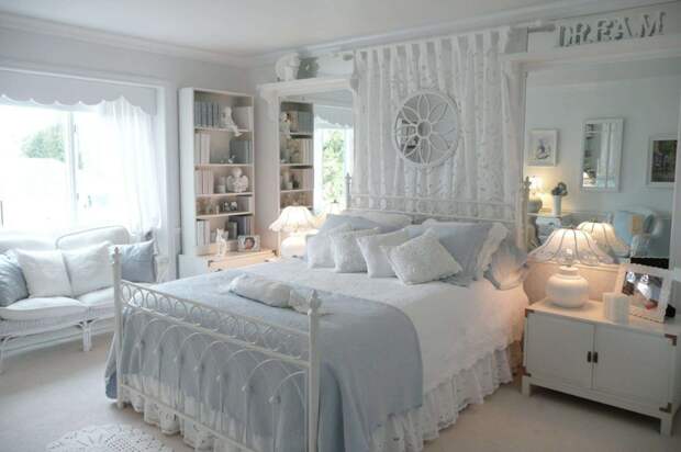 Драпировка вокруг кровати, балдахин и легкая занавеска дополнят композицию в интерьере спальни. Кровать необходимо застелить светлым постельным бельем с кружевами. Декоративные подушки станут прекрасным украшением.