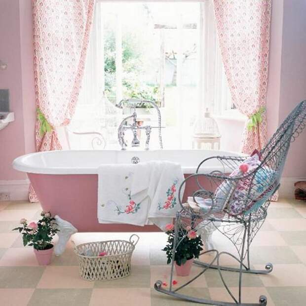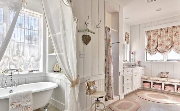 Шебби-шик в интерьере ванны оформить еще сложнее, чем на кухне, потому что мебель из натуральных материалов и обилие текстиля применять там нецелесообразно. Но если помещение обладает достаточными габаритами, то это может удаться.