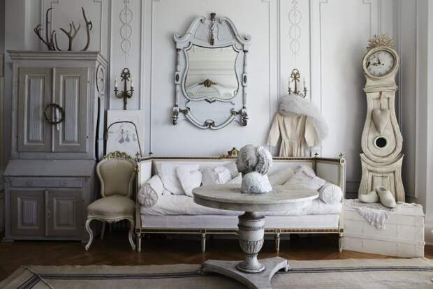 При создании интерьера стоит посетить блошиные рынки и другие места, где продают антикварные предметы. Если там будет резной рисунок и фигурки ангелочков, это только поможет в создании нужной композиции. Главное, чтобы мебель была выполнена из натурального дерева, возможно добавление металла.