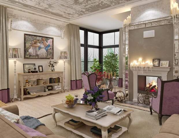 В центре, как правило, стоит мягкий антикварный диван с декоративными подушками. Около него лучше всего обустроить камин или фальш-камин, который можно дополнить кованным декором.