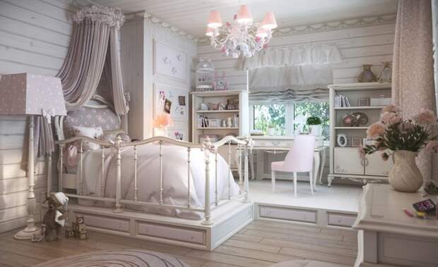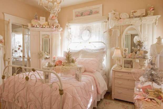 У маленькой принцессы кровать можно снабдить бини-балдахином, а рядом поставить потертый комод с антикварными статуэтками или куклами.