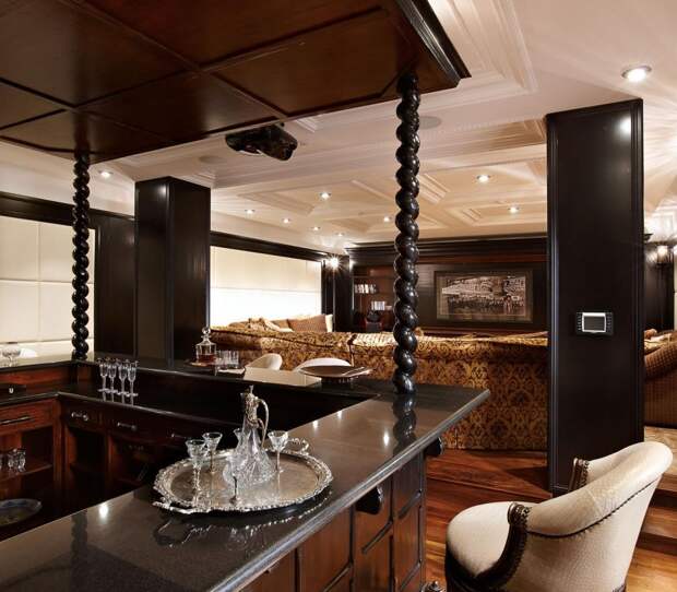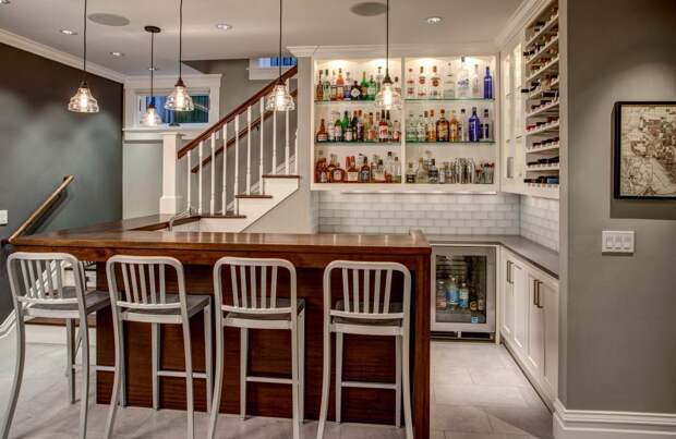 Изготавливать бар своими руками нужно в соответствии с размерами помещения. В просторной кухне можно выделить для этой цели большое пространство, в котором расположится барная стойка, витрина, стеллаж для бутылок и полочки для бокалов.