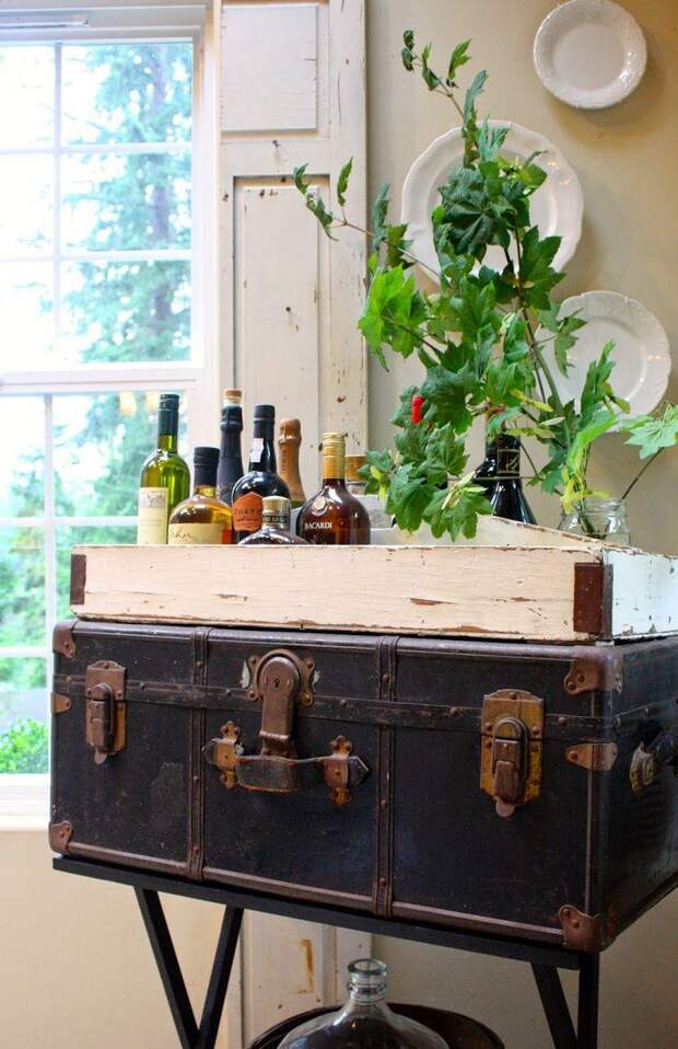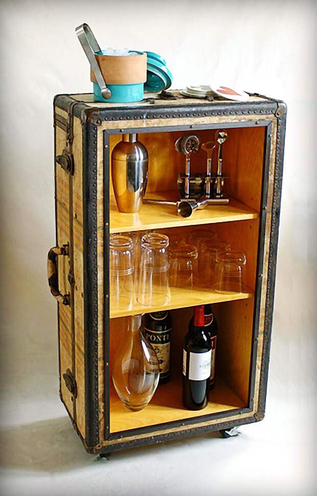 Для изготовления такого бара нужно взять большой старый чемодан, добытый на барахолке или у знакомых. У него можно отрезать крышку и установить горизонтальные полочки перпендикулярно длине. А можно оставить крышку и держать ее все время откинутой, расположив чемодан на подставке. В этом случае бутылки просто составляются на дно чемодана.