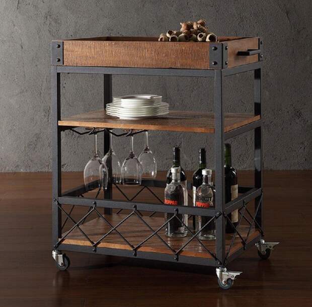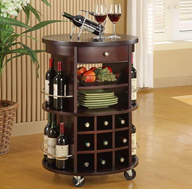 Он может выглядеть как двухэтажная стойка на колесиках или как шкафчик с откидной крышкой. Переносное изделие особенно актуально для маленьких помещений, где нужно максимально сэкономить место. Мобильные бары могут быть и большого размера: такая мебель очень удобна и позволяет периодически делать перестановку в комнате.