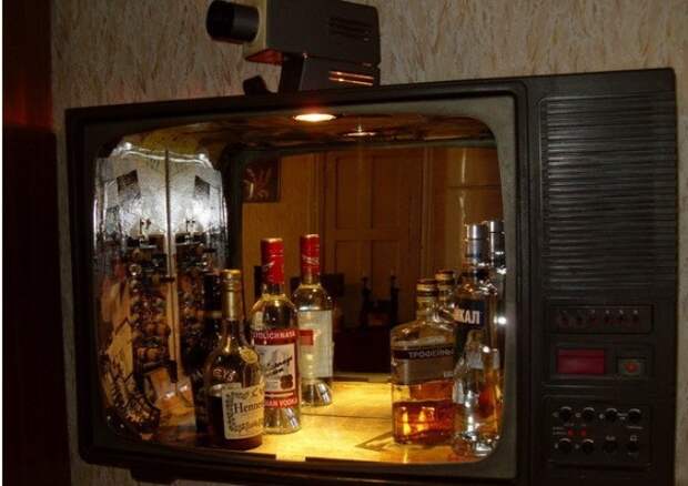 Старый громоздкий электроприбор можно превратить в оригинальный мини-бар. Для этого нужно разобрать его с помощью отвертки и аккуратно вытащить все внутренности. В корпус телевизора монтируются полочки или металлические подставки для бутылок. Такой мини-бар хорошо впишется в интерьер в ретро-стиле или стиле лофт.