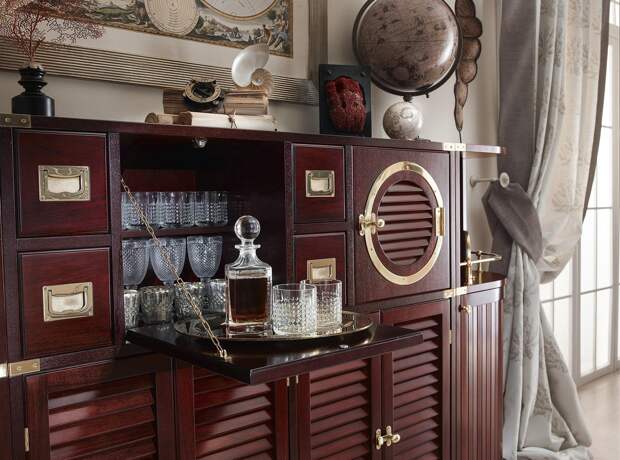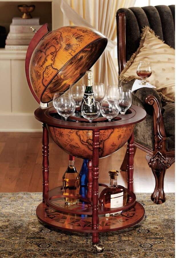 В комнату, предназначенную для работы и ведения деловых переговоров, прекрасно впишется мини-бар в виде старинного глобуса. Если в кабинете есть камин, можно аккуратно расставить на нем бутылки спиртного. Здесь важно соблюсти условие: на видном месте лучше расположить качественный дорогой алкоголь, в этом случае он подчеркнет вкус владельца дома. Если есть из чего выбирать, нужно отдать предпочтение изысканным винам, элитным сортам виски или редким ликерам.