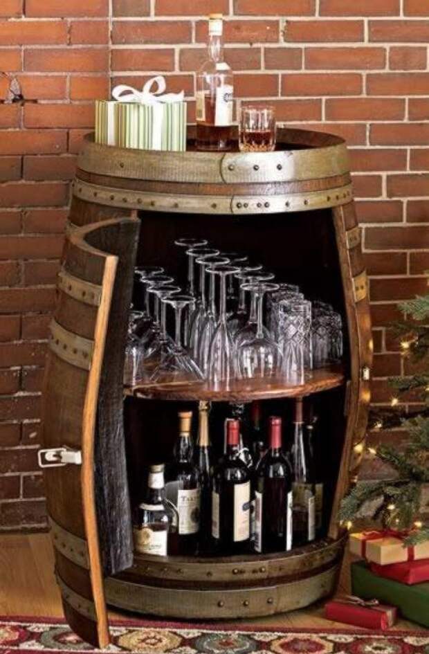 Наиболее простой способ сделать бар своими руками – взять деревянную бочку и просто составить в нее бутылки. Если приложить немного усилий, можно вырезать в стенке отверстие и сделать полки для бокалов и бутылок. Бочку можно поставить в кабинете или гостиной.