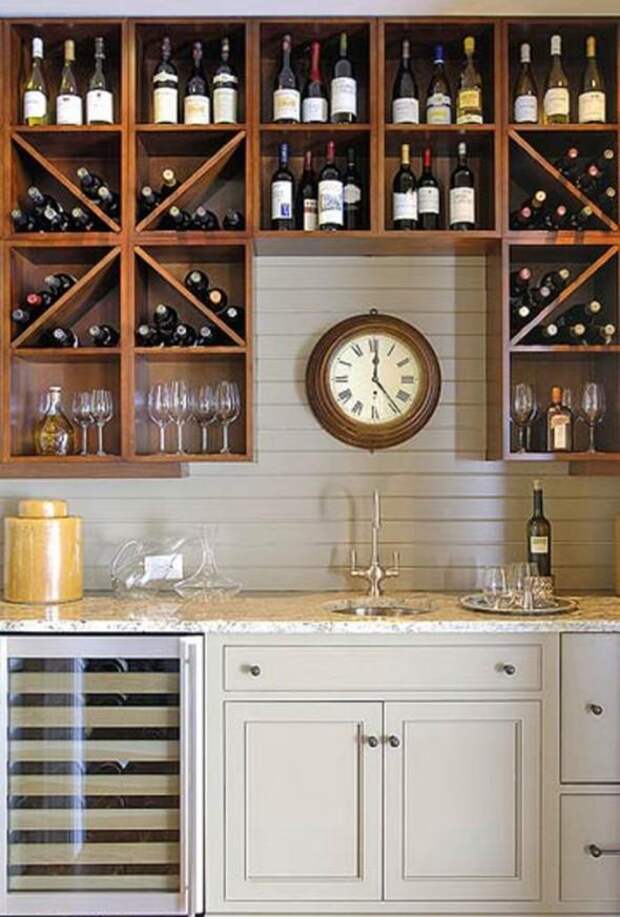 Для небольшого домашнего бара, расположенного в гостиной или на кухне, вполне хватит нескольких горизонтальных полок или подставок под бутылки, монтируемых в мебель (бюджетные варианты можно найти в магазине икеа). При обустройстве места для хранения вина важно учитывать главное правило: чтобы напиток не испортился, его нужно держать вдали от солнечных лучей. Также нужно следить за тем, чтобы рядом не было источников тепла (плита, батарея).