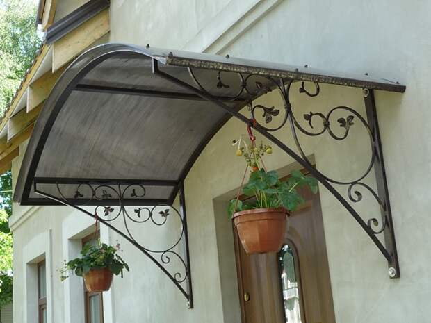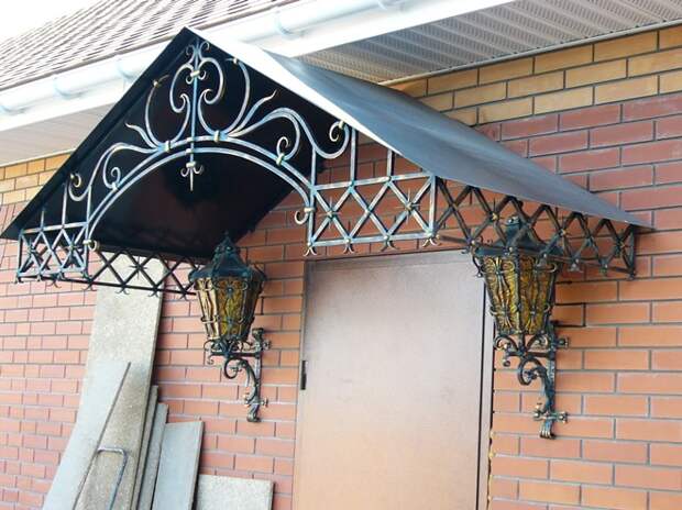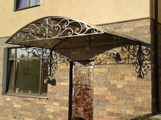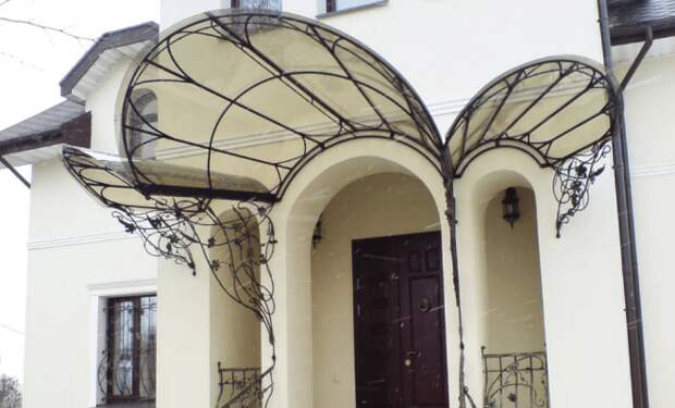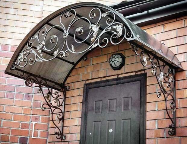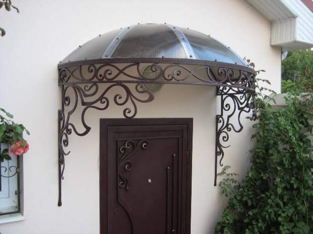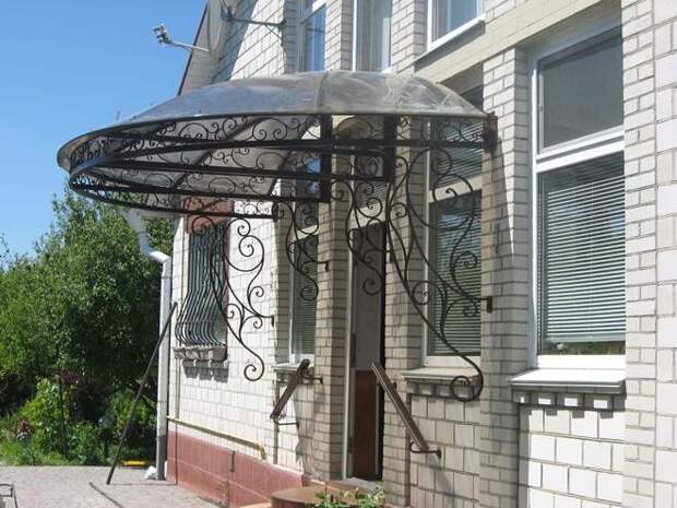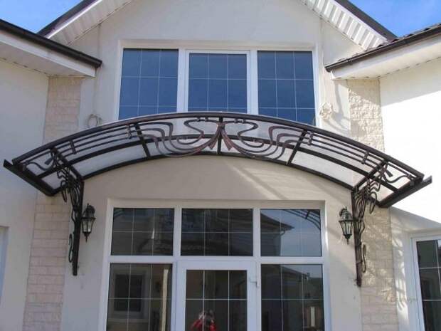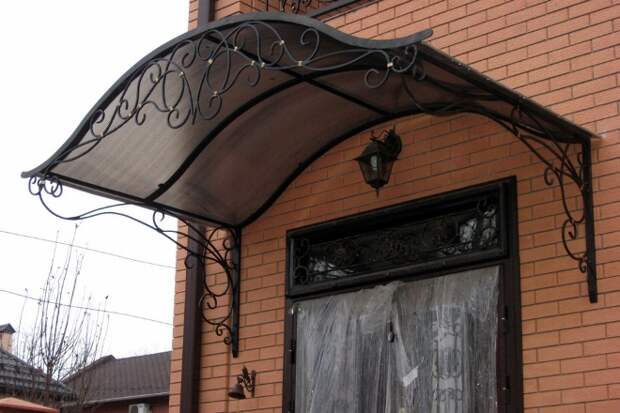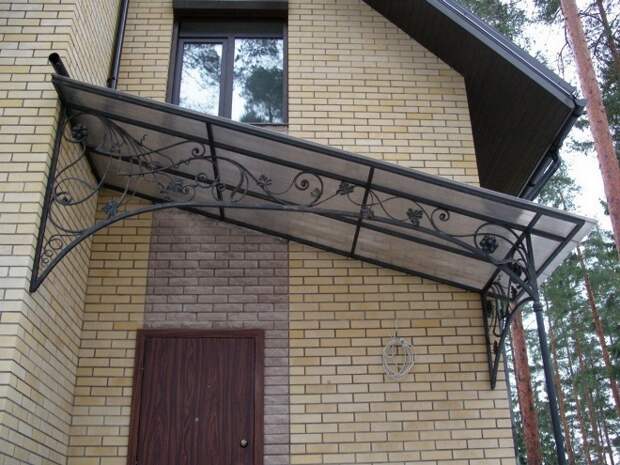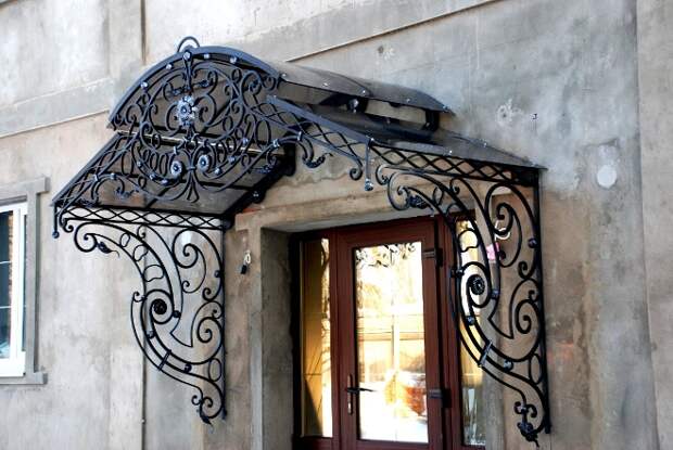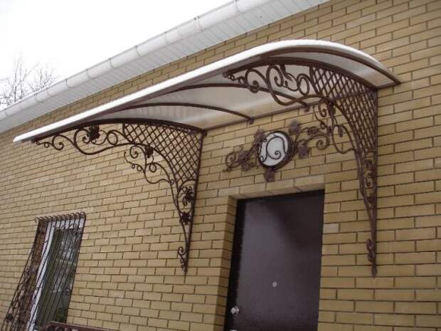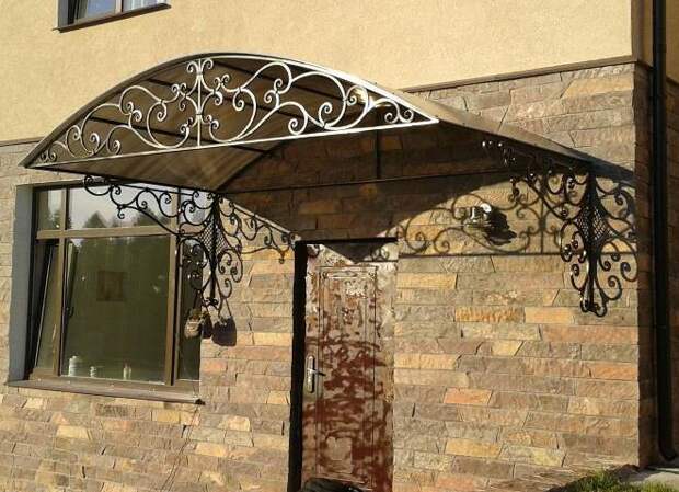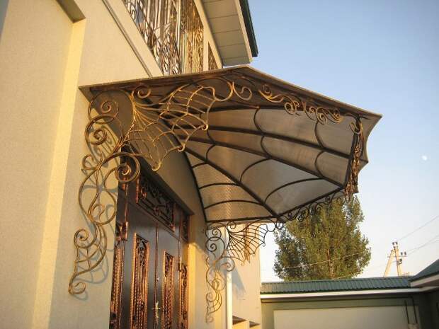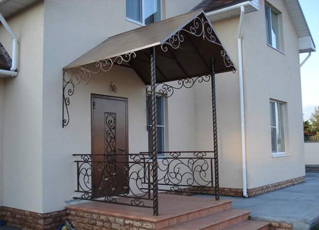 Экономный вариант изготавливается проще. К металлическому каркасу привариваются элементы ковки, которые продаются готовыми в широком ассортименте. Такой навес над крыльцом частного дома достаточно тяжелый, поэтому требует установки прочного крепления. Его монтаж лучше доверить рукам профессионалов.