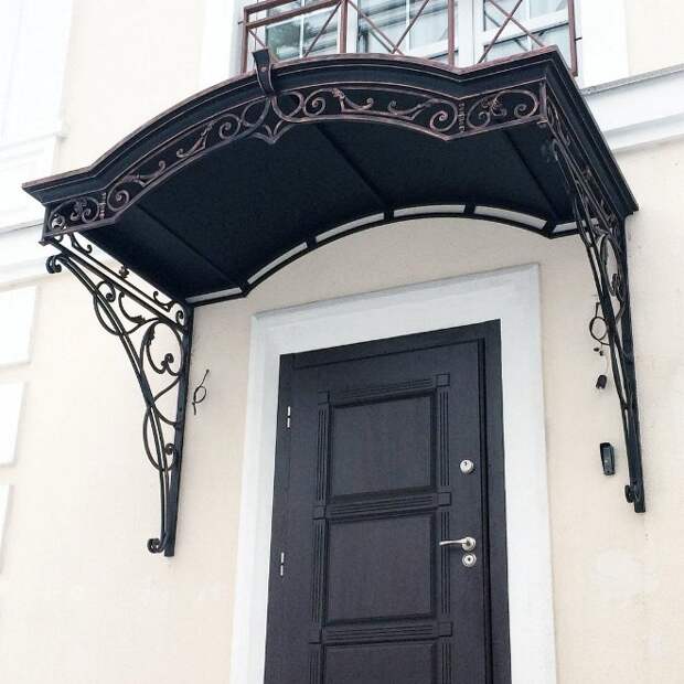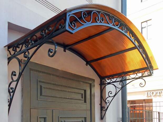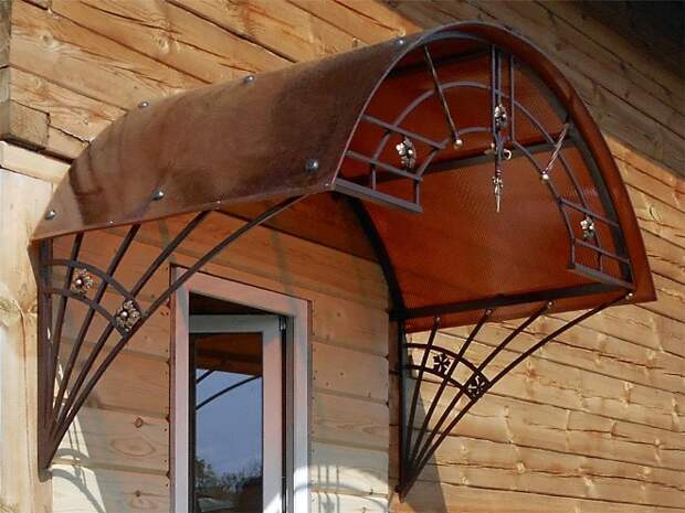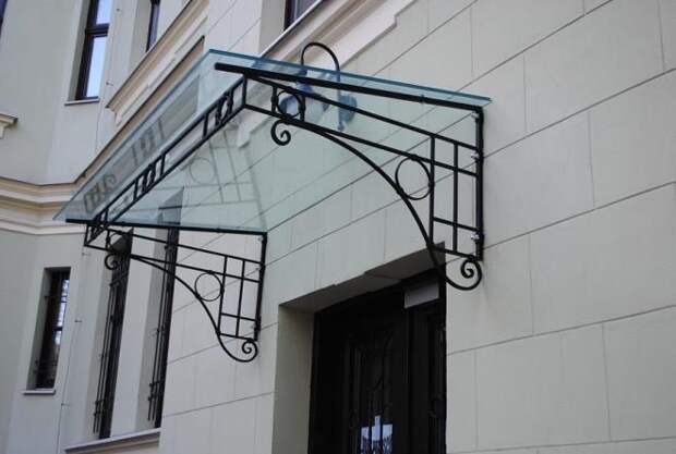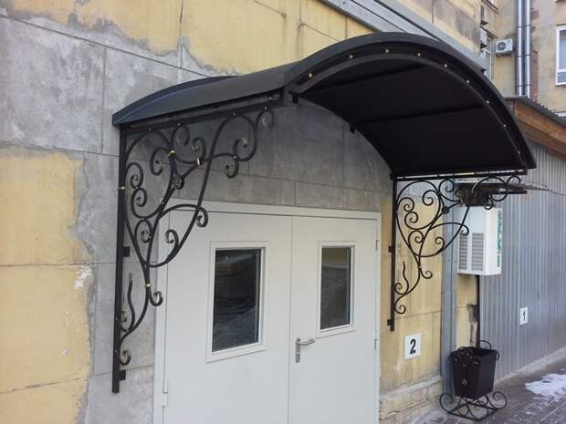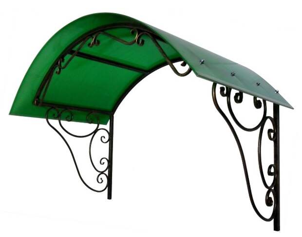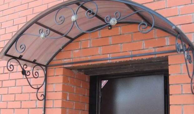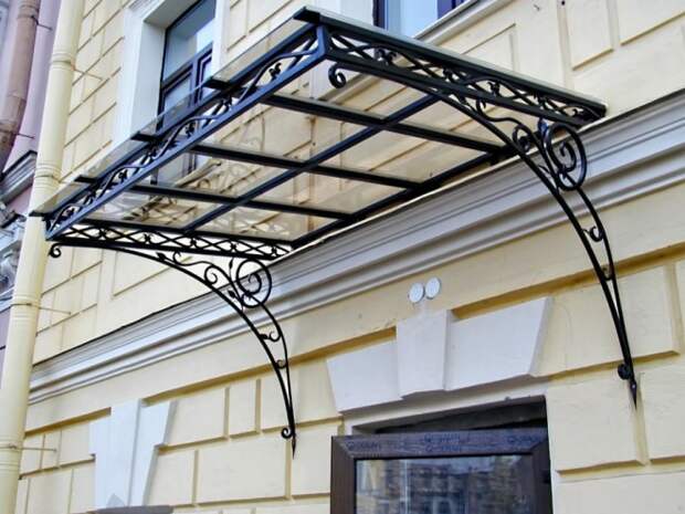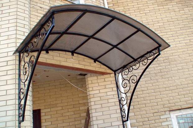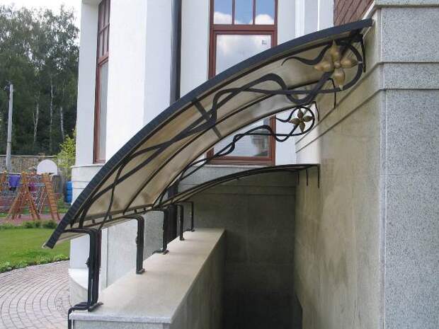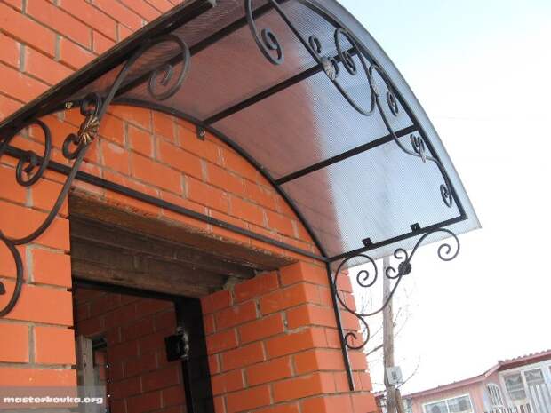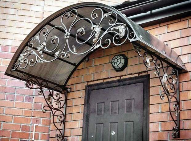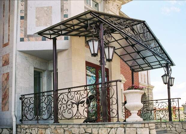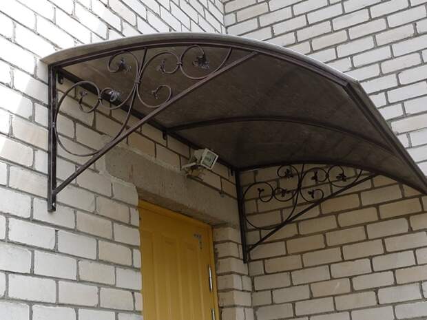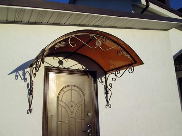 Экономный вариант изготавливается проще. К металлическому каркасу привариваются элементы ковки, которые продаются готовыми в широком ассортименте. Такой навес над крыльцом частного дома достаточно тяжелый, поэтому требует установки прочного крепления. Его монтаж лучше доверить рукам профессионалов.