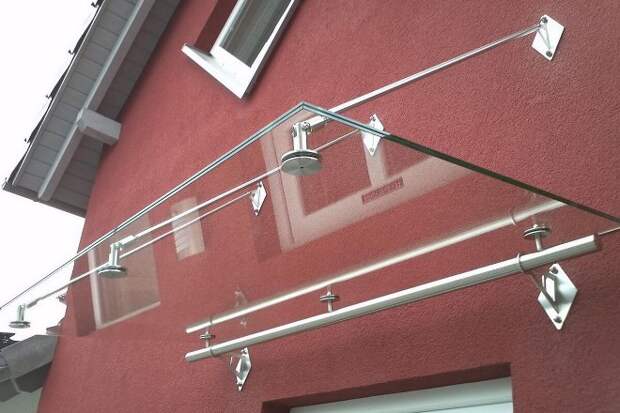 Верх козырька из нержавеющей стали не слишком прихотлив в монтаже, но требует сварочных работ. Из этого материала можно конструировать только простые формы навесов. У него достаточно большая масса, что требует установки крепких опор в виде металлических столбов, уголков или труб, которые необходимо забетонировать.