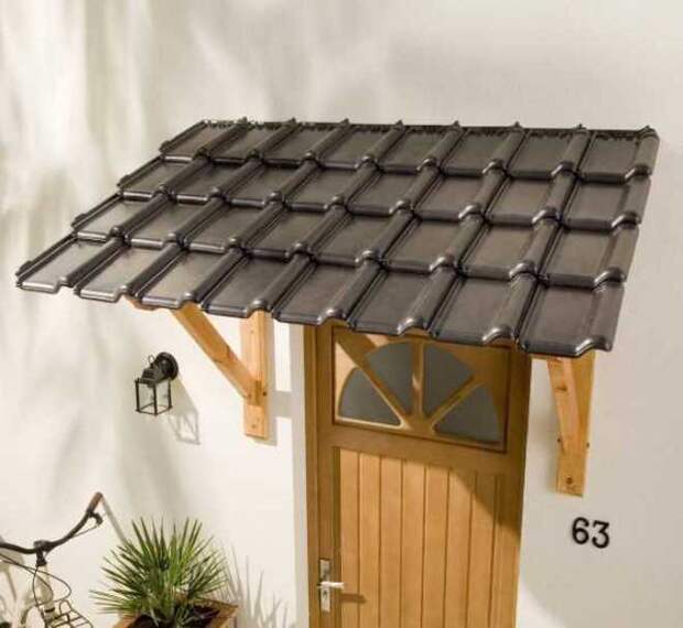 Широкая цветовая гамма, от однотонных оттенков до имитации камня или дерева, позволяет создать неповторимый козырек над входом. Из профнастила можно сконструировать двускатную конструкцию, плоскую или в виде арки. Следует учитывать, что она не будет пропускать свет, поэтому не рекомендуется делать ее слишком закрытой.