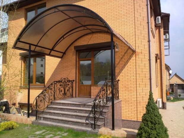 Самый простой и дешевый навес будет защищать крыльцо и иметь аккуратный вид. Зачастую такие конструкции выполняются из поликарбоната, профнастила и других недорогих материалов. В любом случае они должны сочетаться с дизайном фасада здания и выполнять свои прямые функции. Поэтому следует выбирать единые с домом цветовые решения и дизайн.