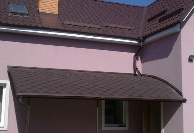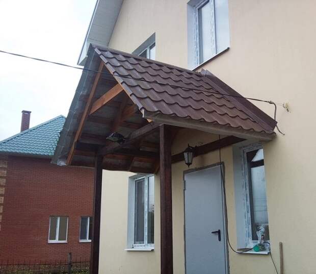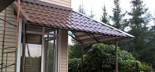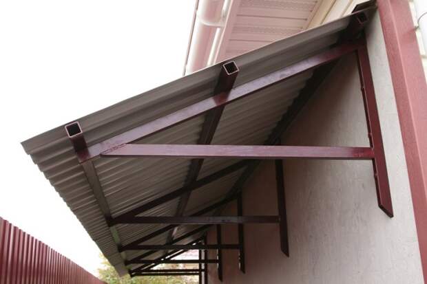 Данный вид навеса один из тех, которые не слишком сложно сделать самостоятельно. Для него следует установить сварный каркас, к которому затем прикрепить саморезами или болтами профильный лист.