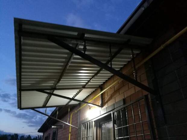Для прямого козырька необходимо первым делом сварить основу в виде буквы П. Если планируется нетяжелая крыша, металл можно брать угловой. Затем к ней крепятся остальные элементы. Это может быть лист поликарбоната, металла или профнастила, пластик или стекло.