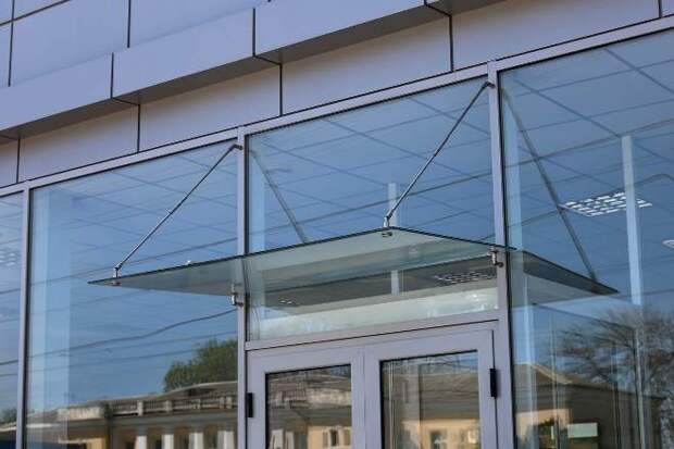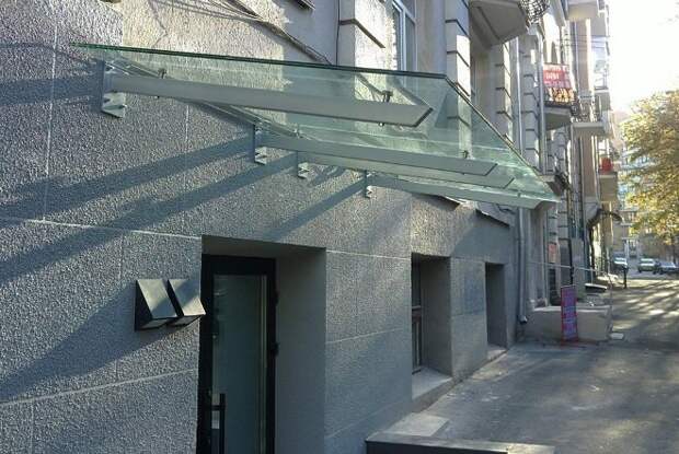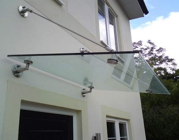 Стеклянные козырьки устанавливаются довольно редко. Они не гармонируют с большинством архитектурных решений, кроме тех, что выполнены в стиле минимализм. Из-за дороговизны материала его не применяют над входами в гаражи, подвалы и другие второстепенные помещения.