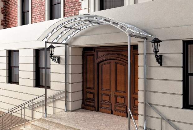 Козырек дарит не только эстетическое удовольствие от красивого вида входа в дом, но и выполняет защитную функцию, укрывая от непогоды входящих и выходящих из помещения людей. Конструкции устанавливают над входом в подъезд многоэтажек, частных домов, дач, офисных зданий, магазинов, хозпостроек, гаражей и т.