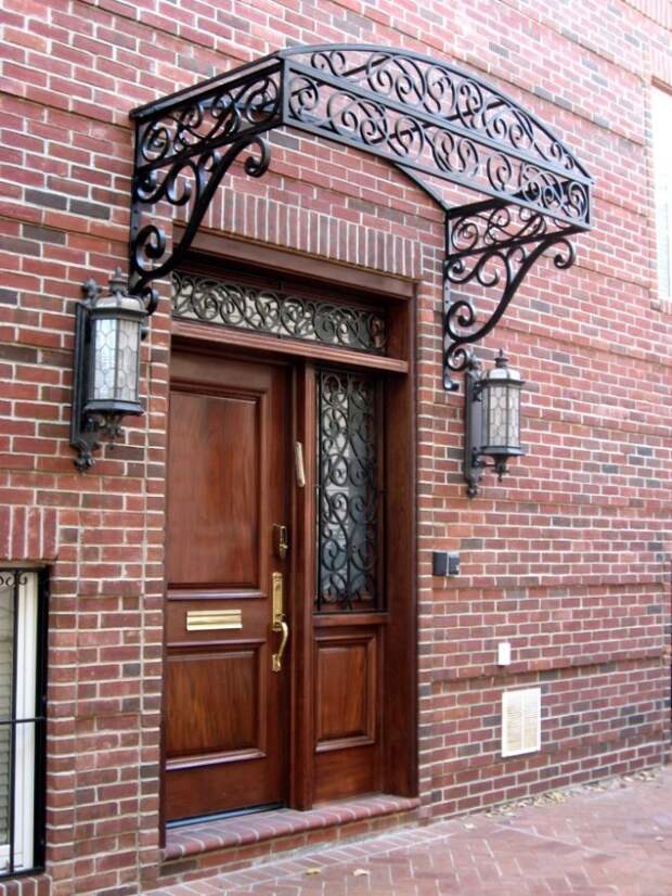 Очень стильно и изящно смотрятся при оформлении входа в дом конструкции из ковки. Они долговечные и надежные, подчеркивают вкус хозяина дома, придают зданию благородный вид. Но оригинальное литье или кованый узор мастера предполагает большие финансовые затраты.