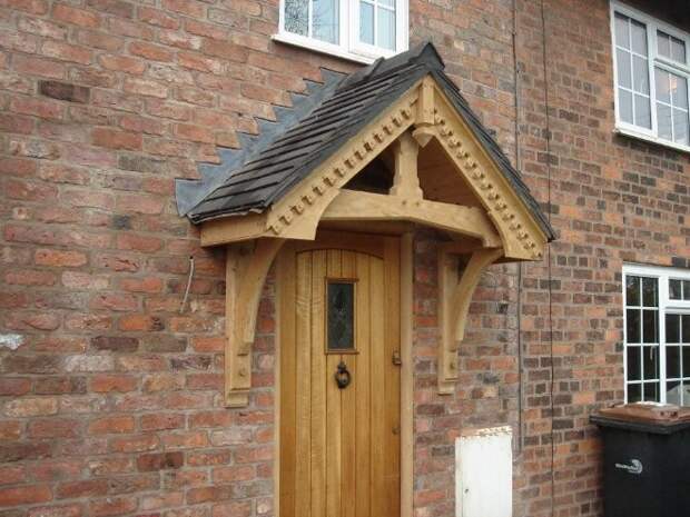 Этот материал, подаренный природой, впишется не в каждый фасад идеально. Он подходит к домам из кирпича, дерева, камня или если на здании есть другие деревянные элементы, например, оконные рамы. Часто деревянные козырьки располагают над дощатыми калитками, входами в бревенчатые беседки, дачи. Сооружают из досок, бруса, декорируя затейливой резьбой.