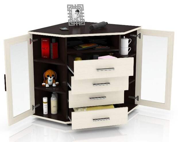 - треугольный не очень популярен, поскольку менее вместителен. Традиционное наполнение – выдвижные ящики или полочки за дверцами;