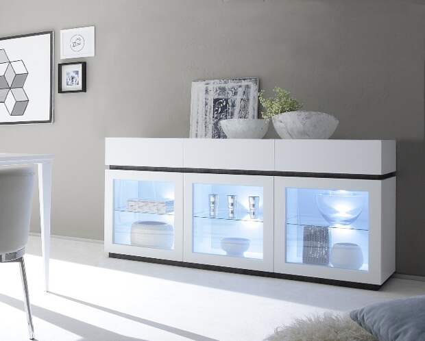 Стильные и необычные конструкции создают из закаленного стекла. Уникальные и креативные модели украсят зал или столовую, оформленную в стиле хай-тек, минимализм. Изысканные комоды с дверцами, украшенными деревянными элементами, органично впишутся в классические интерьеры. За стеклянными дверцами отлично видно содержимое. Поэтому основная функция мебели – декоративная. На полках расставляют красивую посуду, столовые сервизы.