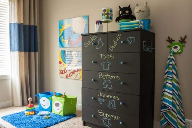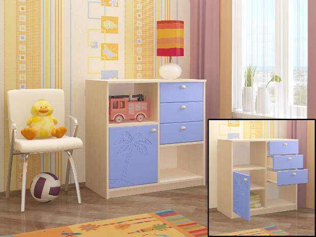 Естественно, что для детской комнаты подбирается красивая, экологичная и безопасная мебель. Подходящий вариант – комод из натуральной древесины светлого оттенка. Выдвижные ящики настолько удобны в пользовании, что тумбы приобретаются надолго – мебель «взрослеет» вместе с ребенком. Учитывая эту особенность, производители стали выпускать изделия со специальными яркими наклейками, которые нравятся малышам. Когда ребенок вырастет, декор можно благополучно убрать.