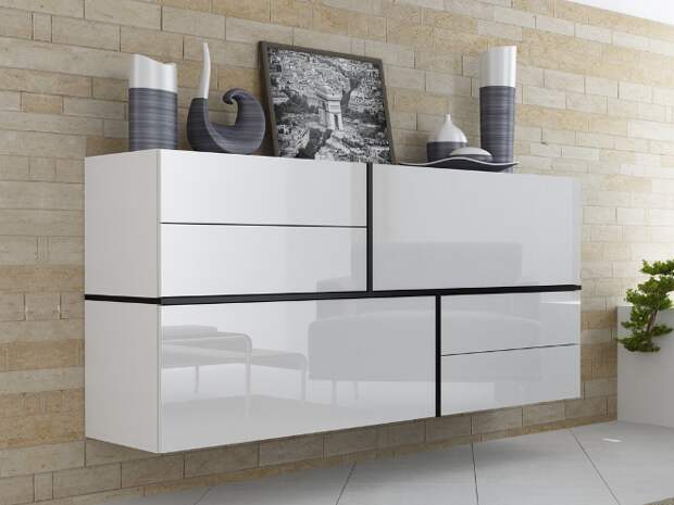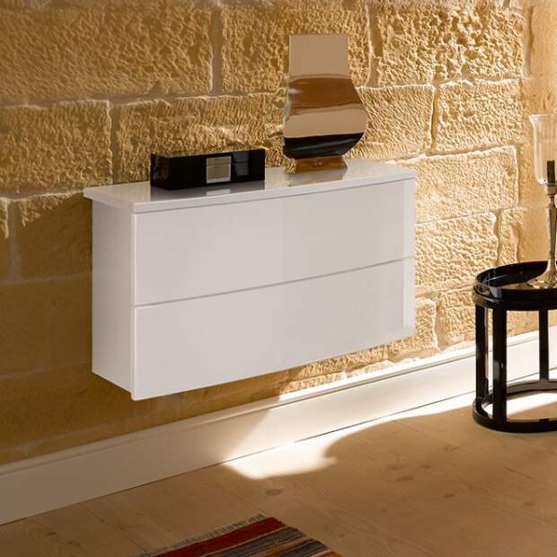 Комоды без ножек фиксируют на стене. Крепить такое изделие можно только на крепкую толстую стену. Актуально использовать подвесные тумбы в помещениях малой площади. Как вариант – в ванной комнате, в холле загородного дома или в прихожей.