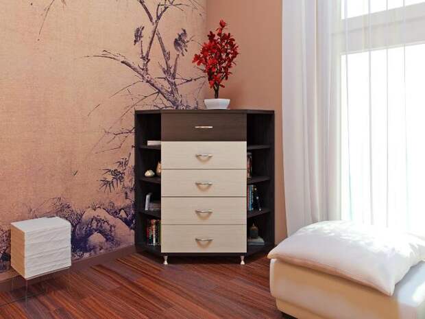 Такие изделия всегда смотрятся интереснее, чем традиционные модели. Задние стороны комода расположены под прямым углом. Форма фасада может быть разнообразной: